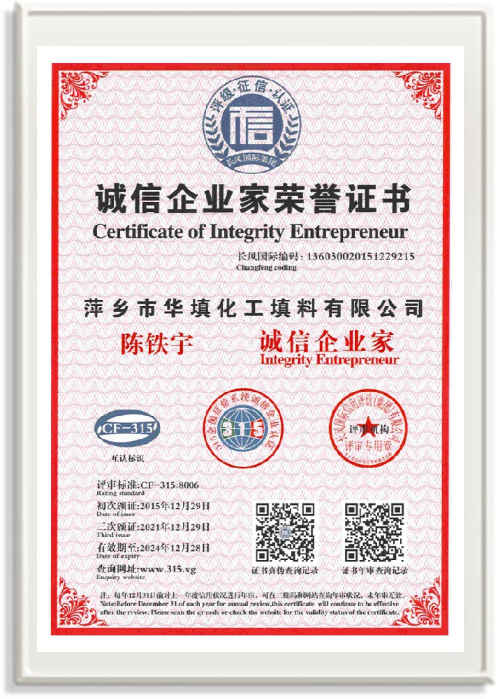 萍鄉市華填化工填料有限公司,位于320國道、109國道、浙贛鐵路、昌金高速公路貫穿其中,交通便利,是江西西部一顆燦爛明珠,創建于20世紀70年代初期,是中國石油天然氣股份有限公司“能源一號網”會員企業、中國石化物資采購電子商務網絡和中國海洋石油總公司采辦業務系統成員單位,是上海大學江西材料基因組工程產業研究院工業陶瓷產業創新聯盟基地,且通過ISO9001:2015質量管理體系、ISO14001:2015環境管理體系、ISO45001:2018職業健康安全管理體系認證的化工填料生產企業。公司擁有陶瓷、塑料、金屬填料、催化劑、活性氧化鋁、分子篩等產品生產線,現有固定資產3616萬元,占地面積3.8萬平方米。公司具有悠久的生產歷史、雄厚的技術力量和先進的生產工藝設備,可生產工業瓷球(支撐劑)、陶瓷、金屬、塑料質的規整、散堆化工填料及分子篩、催化劑、生化濾料、活性氧化鋁、石化助劑、活性炭、環保材料、耐火材料等系列的200多種規格型號產品。